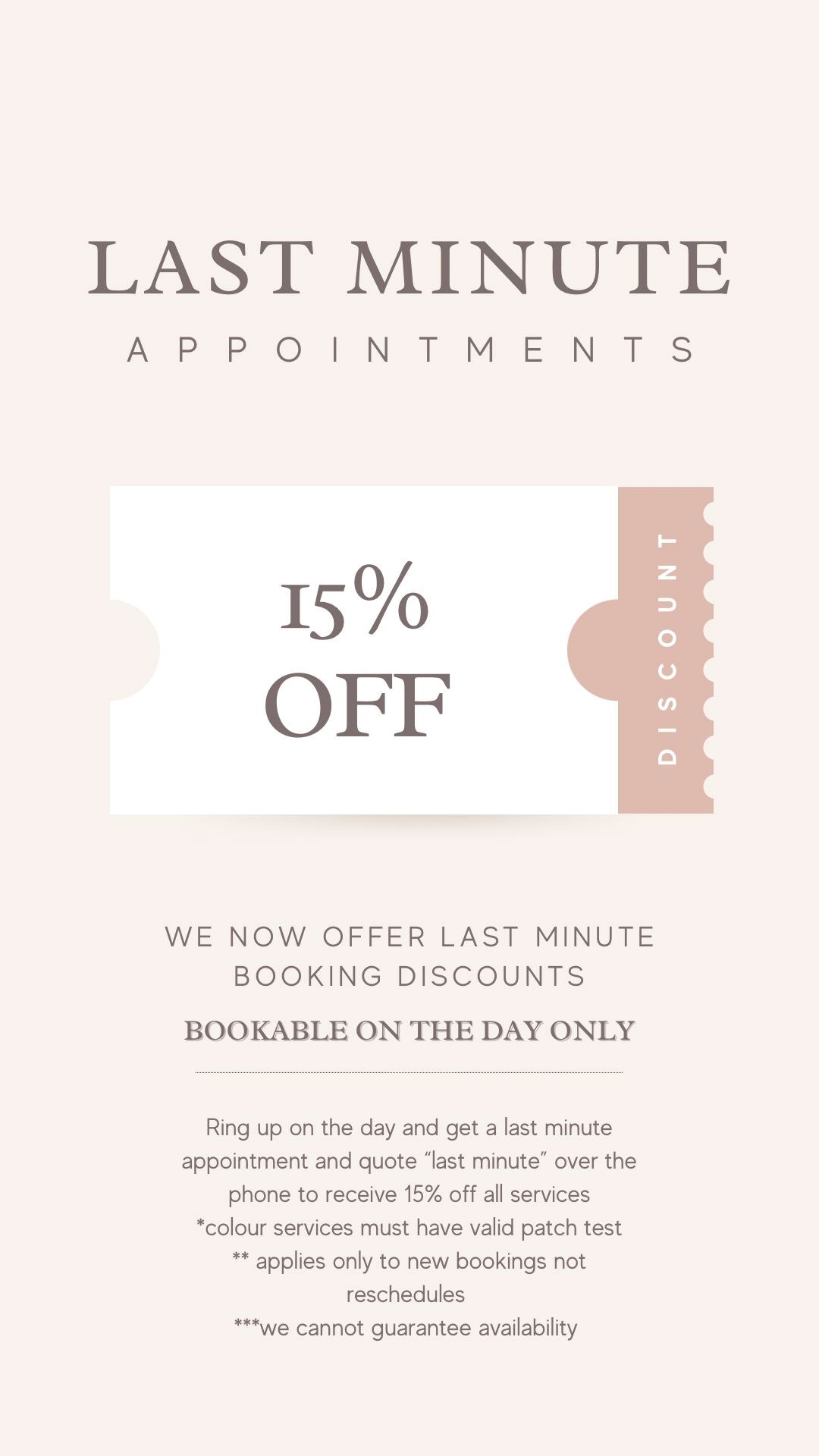 Just ring on the day to check availability and quote "LAST MINUTE" to receive 15% off all services.